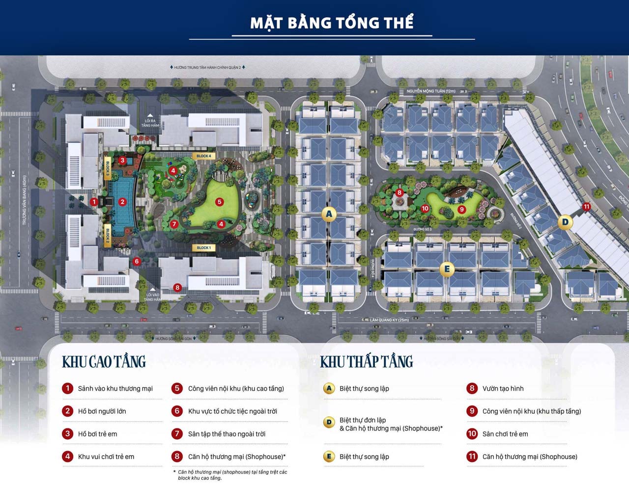 Khu thấp tầng Victoria Village bao gồm 92 căn biệt thự song lập, biệt thự đơn lập và shophouse thương mại, được xây dựng theo phong cách tân cổ điển, kết cấu 1 trệt + 3 lầu, thiết kế sang trọng và tiện nghi. Giá bán cập nhật 12/2025 như sau: