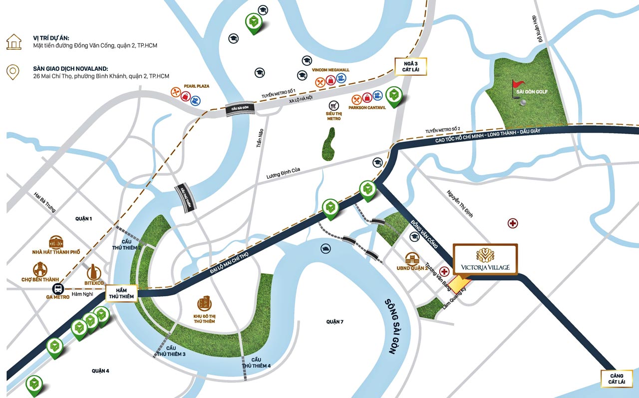 Ngoài tiện ích nội khu, Victoria Village còn nằm gần các tiện ích ngoại khu đẳng cấp trong vòng bán kính 1–5 km: