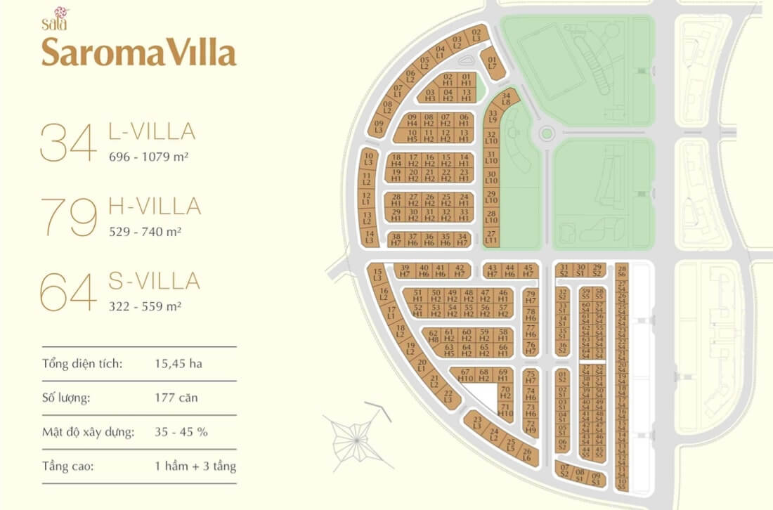 Saroma Villa được quy hoạch trên khu đất rộng 15,54ha, cung cấp ra thị trường 117 căn biệt thự đơn lập và song lập, bàn giao hoàn thiện thô. Mỗi căn biệt thự đều xây dựng 1 hầm – 1 trệt – 3 lầu, diện tích linh hoạt từ 332m² đến 1.079m².