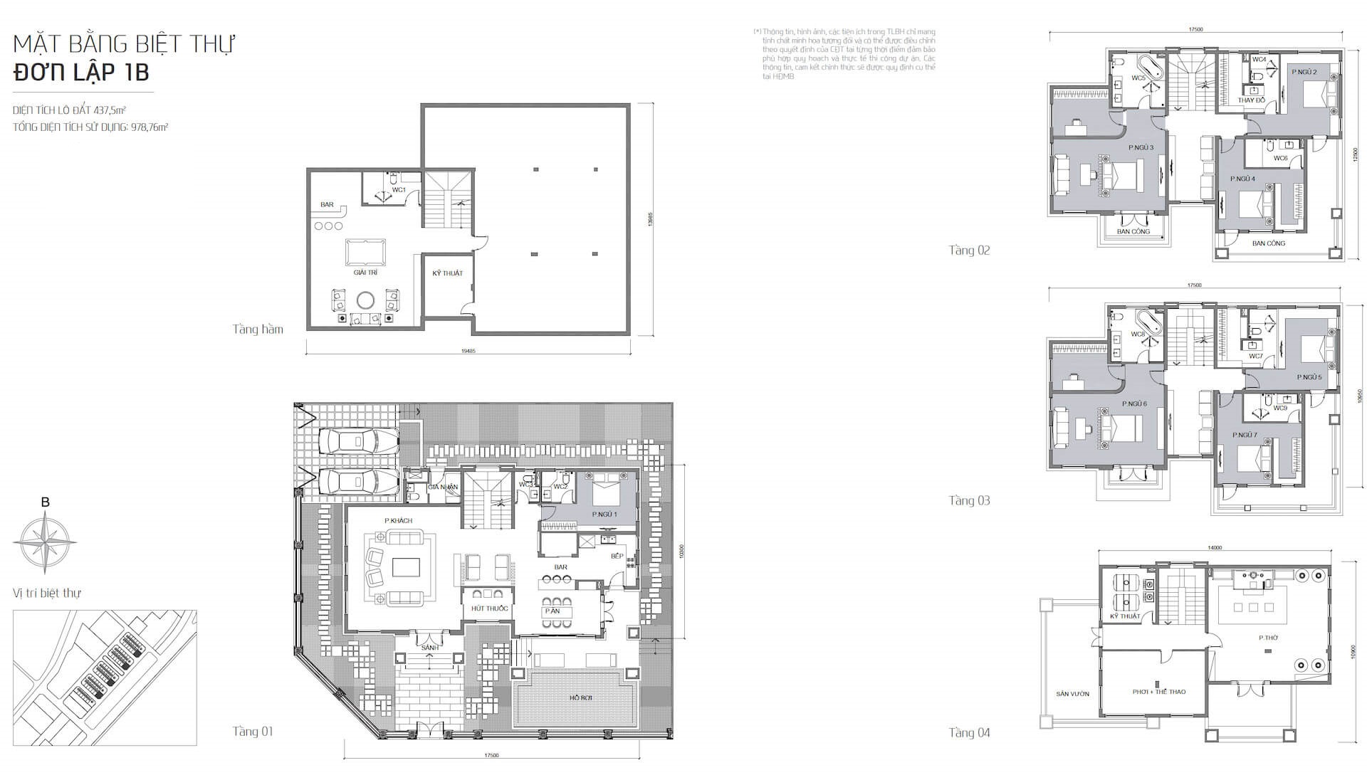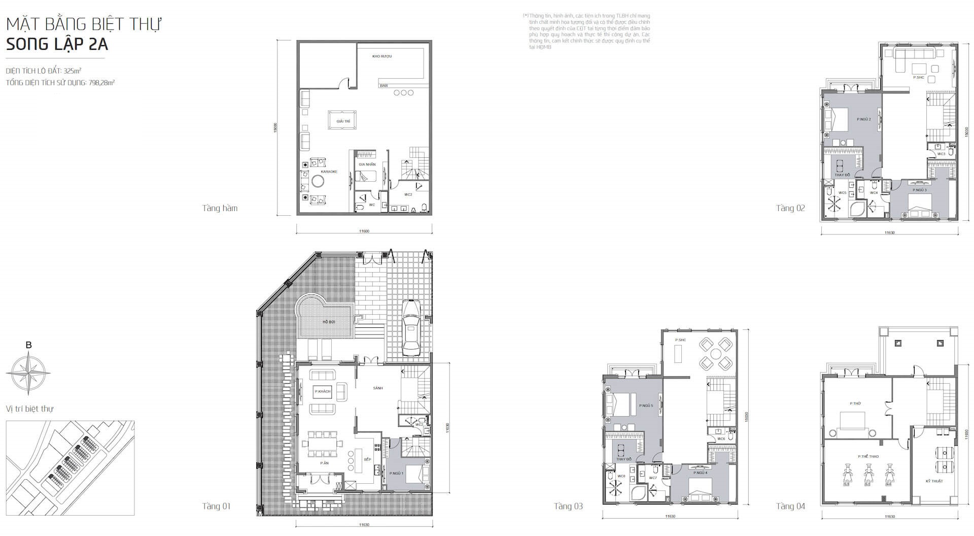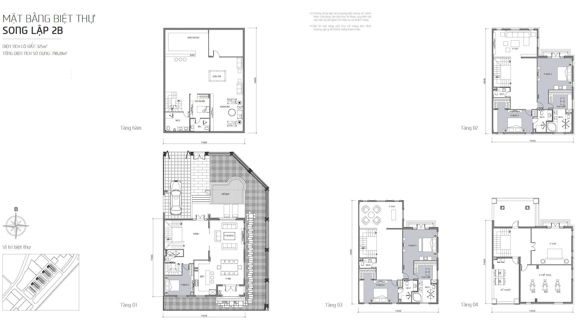 • Công năng: bố trí đầy đủ các không gian sinh hoạt cao cấp như phòng ngủ, phòng khách, bếp – bàn ăn, phòng thờ, phòng thể thao, khu giải trí, bar, phòng kỹ thuật, sân vườn, hồ bơi, ban công, phòng thay đồ và hệ thống vệ sinh. Toàn bộ được sắp xếp khoa học, tối ưu cho sự riêng tư và tiện nghi.