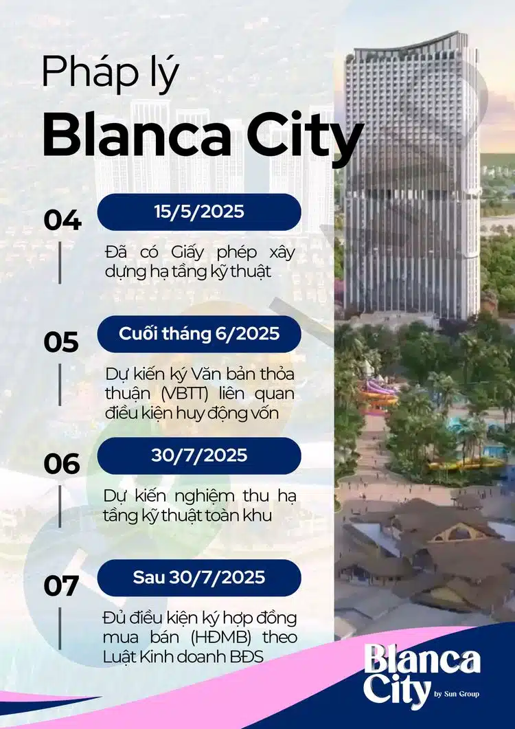 Blanca City – tên pháp lý là Khu đô thị đường 3 Tháng 2 – do Công ty TNHH Đầu tư và Phát triển Đô thị Vũng Tàu, thành viên thuộc hệ sinh thái Sun Group, làm chủ đầu tư. Theo các tài liệu pháp lý được công bố, dự án đã hoàn tất đầy đủ các thủ tục pháp lý quan trọng, bao gồm: