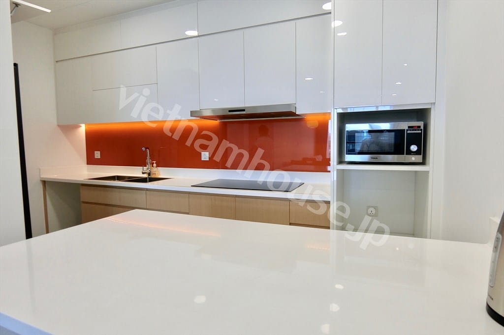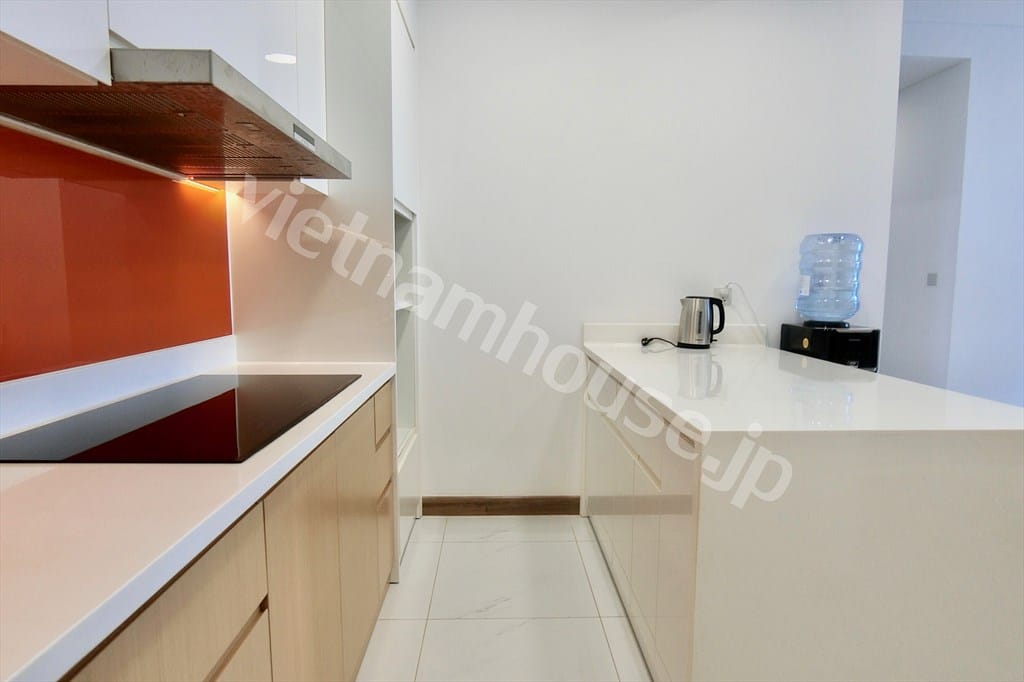 Nhà bếp được trang bị đầy đủ tiện nghi hiện đại, bao gồm bếp điện, hệ tủ bếp trên dưới và không gian chuẩn cho những ai yêu thích nấu ăn tại nhà.