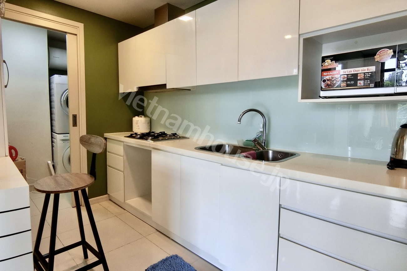 Không gian bếp được thiết kế mở, liền kề với phòng khách, tạo sự kết nối liền mạch trong sinh hoạt. Bếp đã được trang bị đầy đủ các thiết bị hiện đại như tủ lạnh, lò vi sóng, bếp từ và cả máy rửa chén – giúp việc nấu ăn trở nên dễ dàng và tiện lợi hơn bao giờ hết. Khu vực bàn ăn nhỏ gọn nhưng đủ thoải mái cho bữa cơm gia đình ấm cúng.