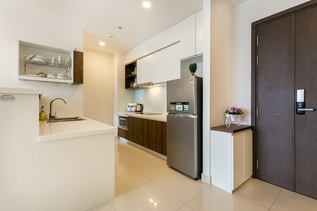 - Khu bếp đầy đủ thiết bị: bếp từ, lò vi sóng, tủ lạnh, bộ dụng cụ nấu ăn.