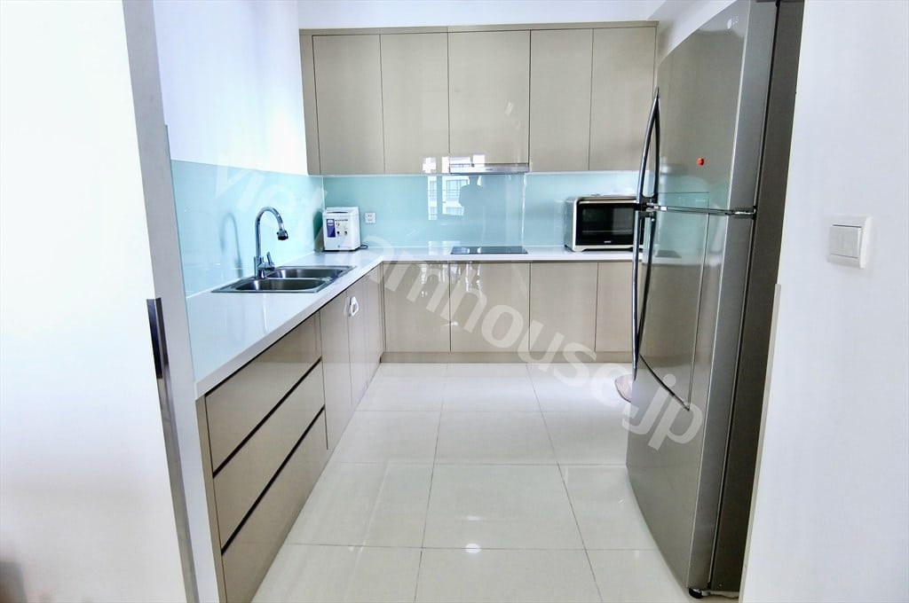 Khu bếp rộng rãi được thiết kế tiện nghi, đi kèm các thiết bị cao cấp như lò nướng điện, bếp từ, mặt bàn đá, kính chắn dầu mỡ, bồn rửa đôi và tủ lạnh lớn – hoàn toàn đáp ứng tốt nhu cầu nấu nướng hàng ngày.