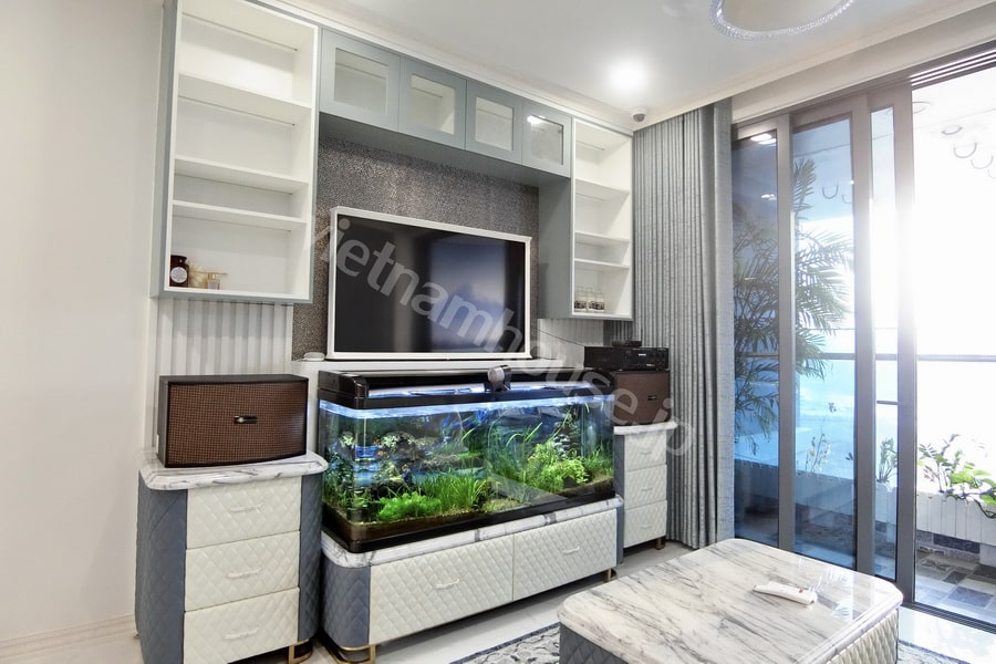 Căn hộ sở hữu lối bài trí độc đáo, mang cảm giác như đang bước vào một thế giới đại dương thu nhỏ. Tông màu chủ đạo mát mắt, chất liệu nội thất được chọn lọc kỹ càng, tạo nên một không gian vừa thư giãn, vừa phá cách.
