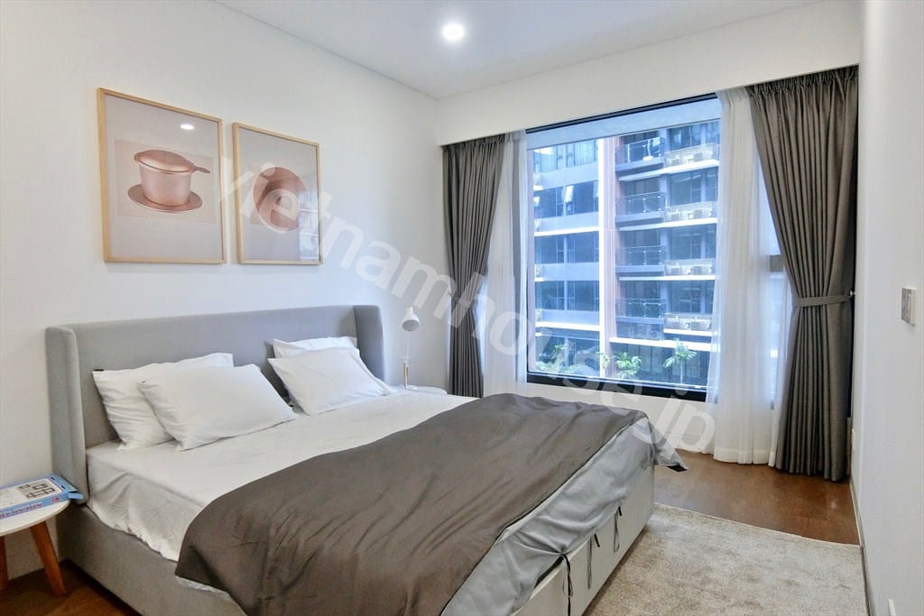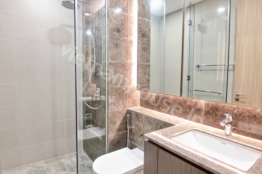 Phòng ngủ được trang bị giường cỡ King thoải mái, tủ quần áo lớn và không gian lưu trữ rộng rãi – lý tưởng cho những ai yêu thích sự gọn gàng. Phòng tắm sử dụng thiết bị vệ sinh cao cấp, có buồng tắm kính và vòi sen rộng, tạo cảm giác thư giãn như spa tại nhà.