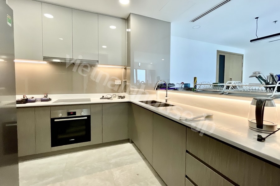 Căn hộ nằm trong dự án cao cấp hàng đầu Thủ Thiêm, sở hữu phong cách thiết kế hiện đại theo lối tối giản. Tông trắng chủ đạo kết hợp hài hòa với mặt đá hoa cương, mang lại cảm giác nhẹ nhàng nhưng vẫn toát lên sự sang trọng. Phòng khách rộng rãi, mở hoàn toàn ra ban công, đón nắng tự nhiên và gió sông, lý tưởng cho những buổi họp mặt gia đình hay đón tiếp khách quý.
