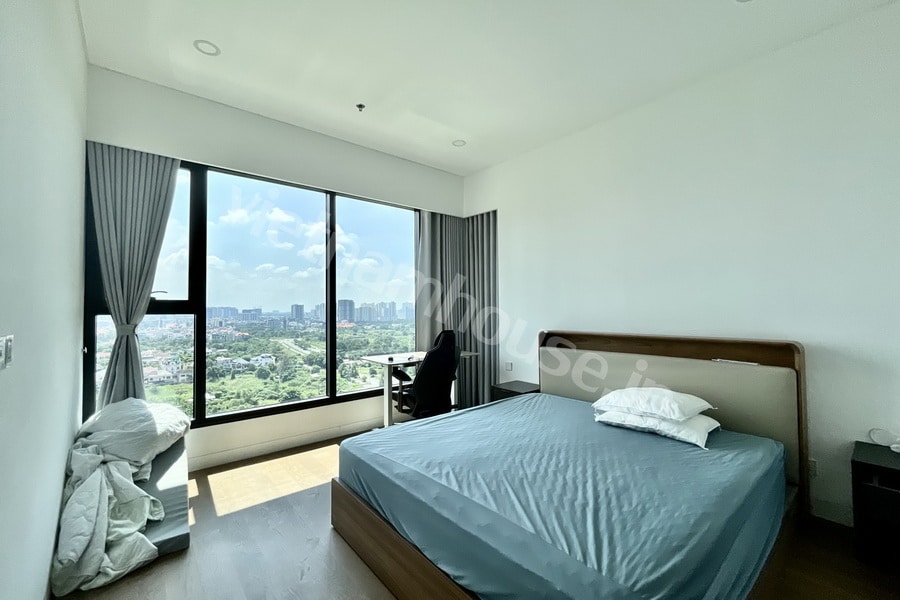Từ ban công tầng cao, bạn có thể phóng tầm mắt ra toàn cảnh sông Sài Gòn và khu công viên ven sông phía dưới. Cảm giác thư thái và thoáng đãng mà không phải căn hộ nào cũng có được, nhất là trong lòng khu đô thị sôi động như Thủ Thiêm.