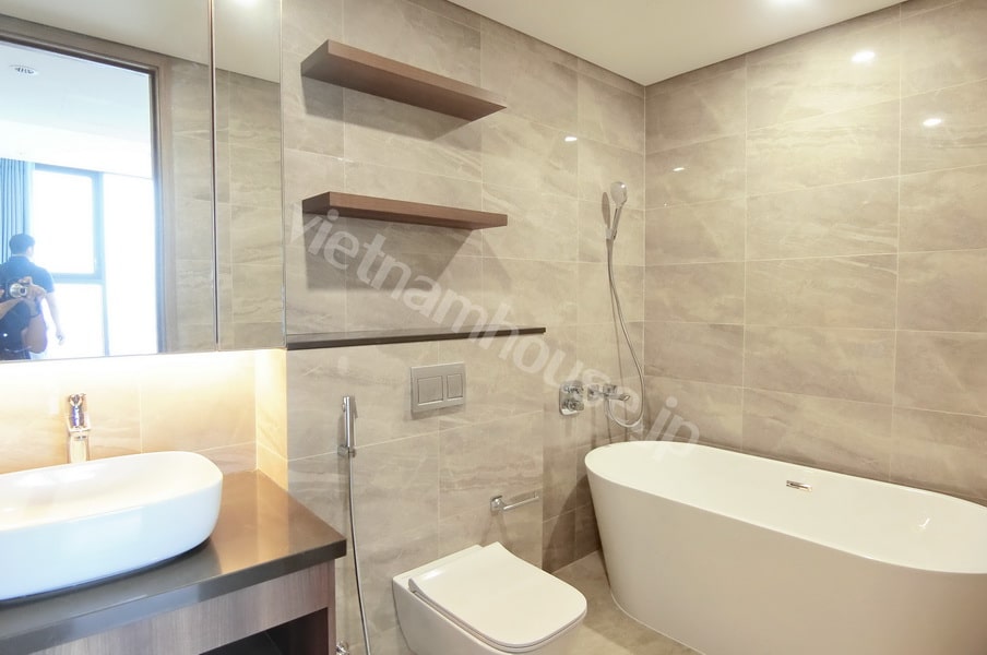 Hai phòng tắm trong căn hộ được hoàn thiện với thiết bị vệ sinh cao cấp, có đầy đủ bồn tắm, vòi sen đứng. Tông màu đá sáng và kính trong suốt giúp mở rộng không gian, tạo cảm giác sạch sẽ, tinh tế và rất “Tây”.