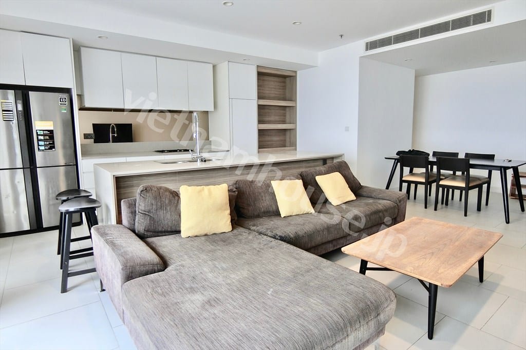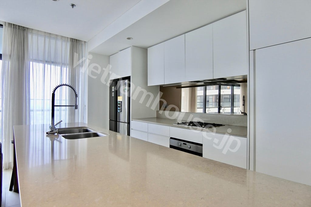 Hai ban công riêng biệt ở hai đầu căn hộ giúp đón nắng, gió tự nhiên cả ngày, đồng thời mở rộng thêm không gian thư giãn ngoài trời. Bếp được hoàn thiện với mặt đá, bếp điện âm và hệ tủ lớn – đáp ứng đầy đủ cho nhu cầu nấu nướng thường nhật.