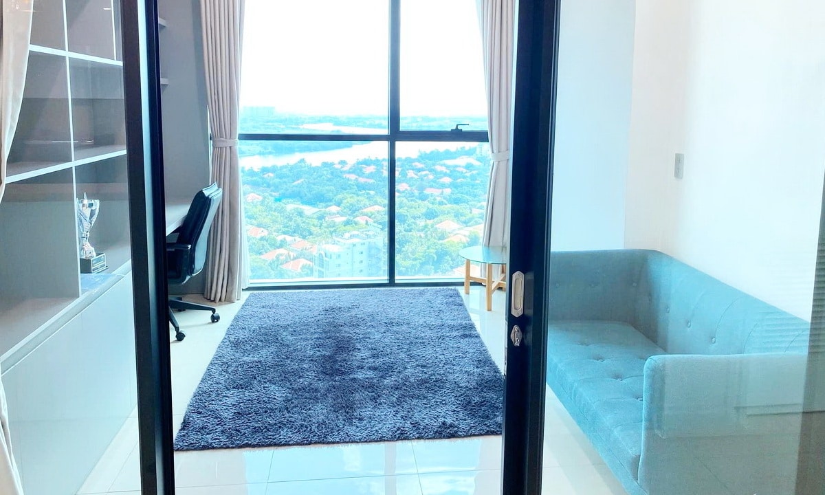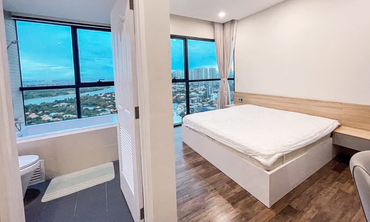 Căn hộ nằm tầng cao, hướng nhìn sông Sài Gòn, đón gió và ánh sáng tự nhiên. Phòng khách và phòng ngủ đều có tầm nhìn thoáng, tạo cảm giác dễ chịu suốt ngày dài.