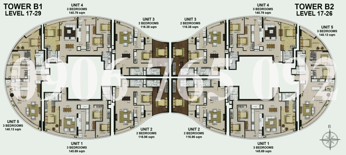 - Căn hộ 3 phòng ngủ diện tích 140m2 – 160m2.
