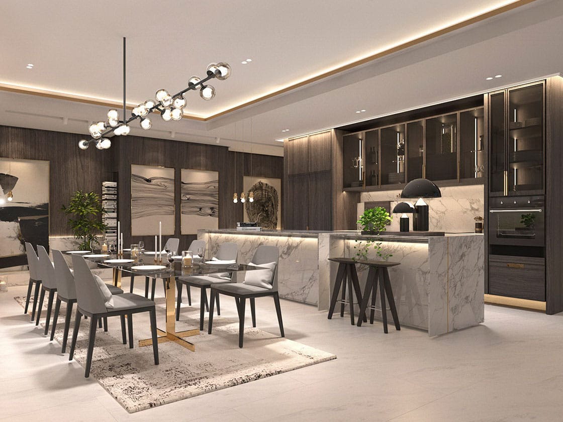 Khu vực phòng khách và bếp được ngăn cách theo kiểu ước lệ, vừa đảm bảo công năng sử dụng, vừa giữ được sự liền mạch và ấm cúng cho sinh hoạt gia đình. Đây cũng là yếu tố giúp City Garden được đánh giá cao về trải nghiệm sống thực tế, đặc biệt với khách hàng ở lâu dài.