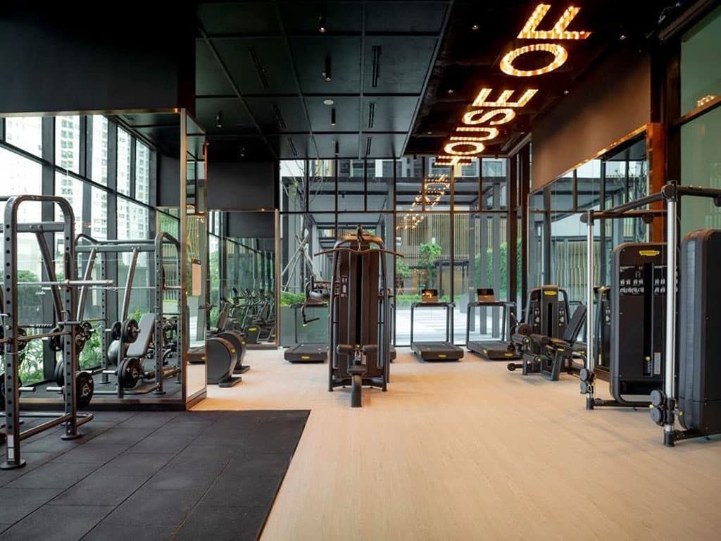 - Phòng Gym trang bị máy móc hiện đại của Technogym, bố trí tại tháp Bass, hướng nhìn ra công viên nội khu.