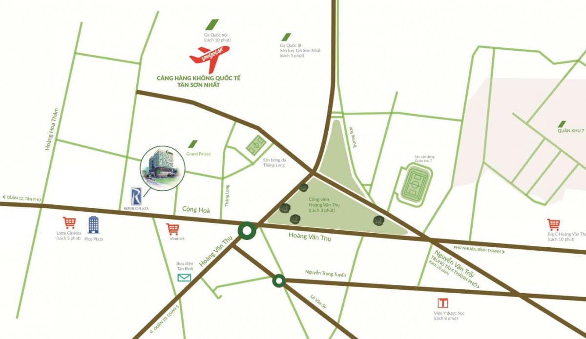Đường Cộng Hòa là trục giao thông huyết mạch, kết nối nhanh đến các quận trung tâm và hệ thống tiện ích ngoại khu hiện hữu. Từ Republic Plaza, cư dân dễ dàng di chuyển đến nhiều địa điểm quan trọng như: