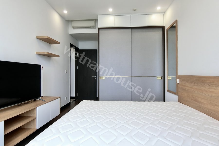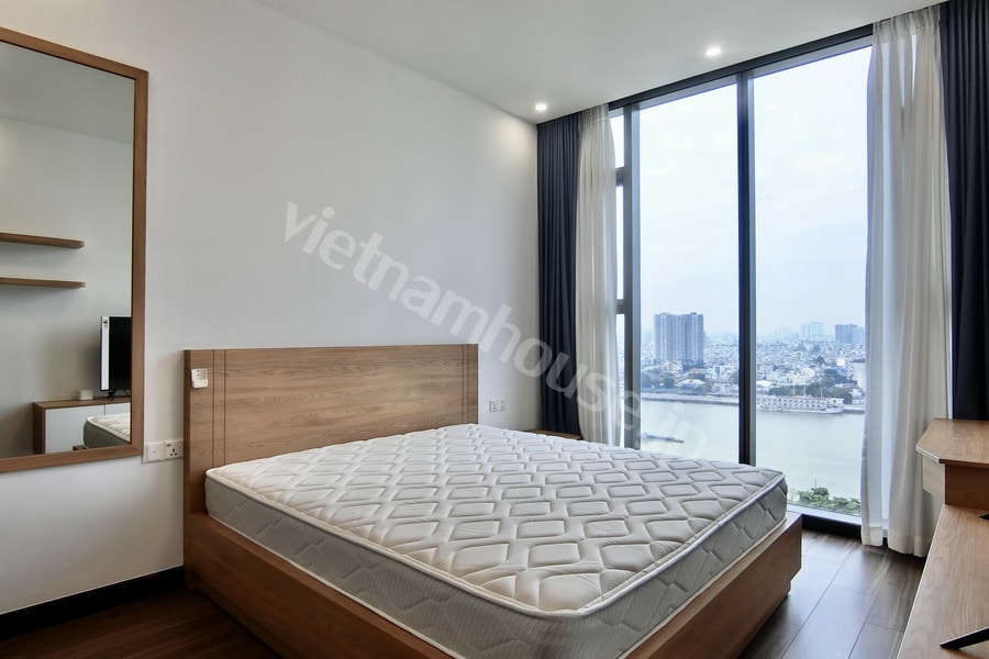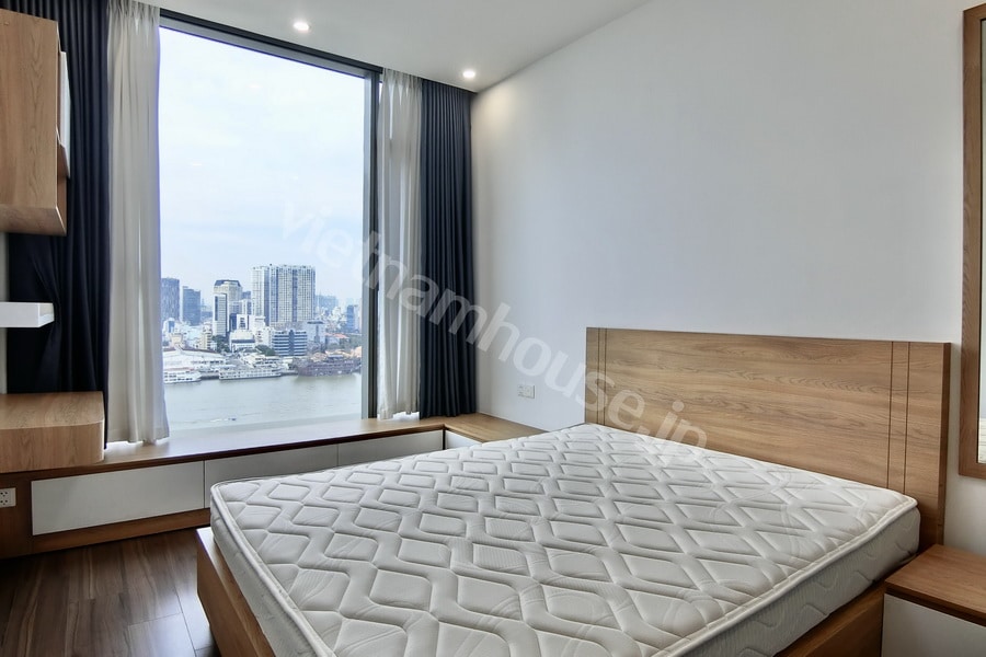 Phòng ngủ chính trang bị giường lớn, nệm dày chất lượng cao cùng bộ chăn ga gối đệm mềm mại – mang lại cảm giác nghỉ ngơi trọn vẹn sau một ngày dài. Cửa sổ lớn mở ra tầm nhìn bao quát thành phố, đón ánh sáng tự nhiên mỗi sớm mai.