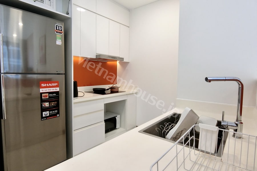 Khu bếp được trang bị hệ tủ tiện dụng, tích hợp các thiết bị cao cấp – sẵn sàng phục vụ mọi nhu cầu nấu nướng. Từng chi tiết trong căn hộ đều được chăm chút kỹ lưỡng, tạo nên một tổng thể hài hòa giữa công năng và thẩm mỹ.