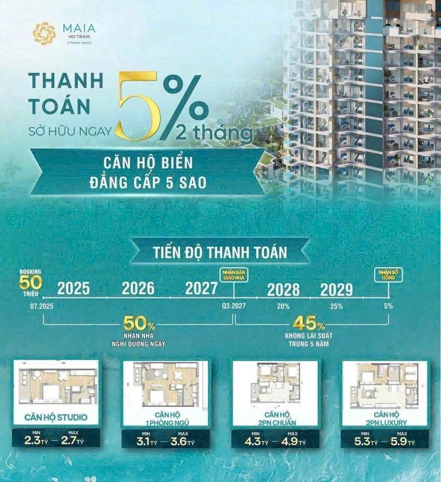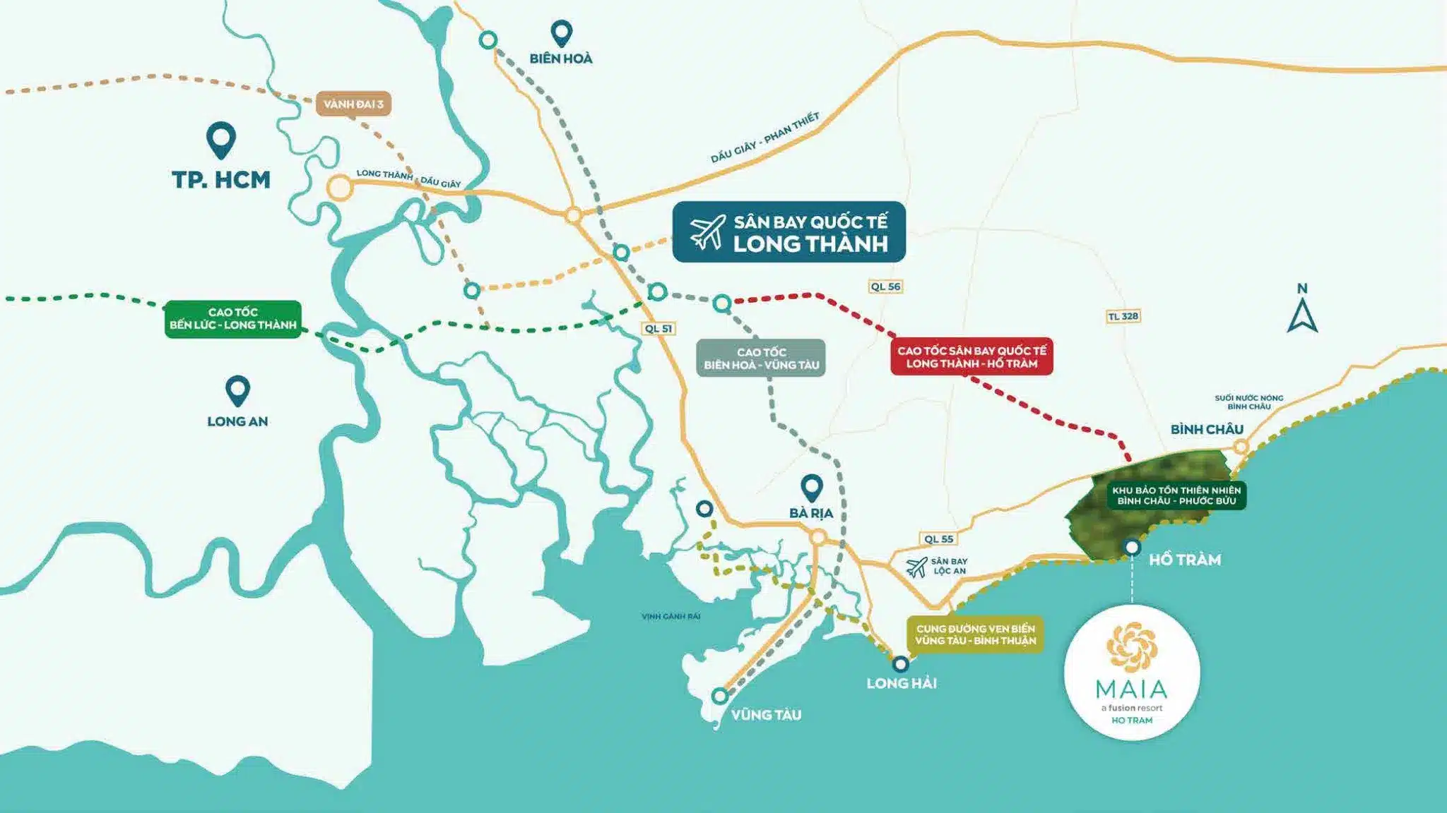Maia Resort Hồ Tràm là phân khu mới thuộc tổ hợp tỷ đô The Grand Hồ Tràm, do Warburg Pincus và VinaCapital hợp tác phát triển. Dự án sở hữu vị trí đắt giá giữa biển xanh và rừng nguyên sinh, đón đầu hạ tầng đang tăng tốc tại Hồ Tràm – Bình Châu.