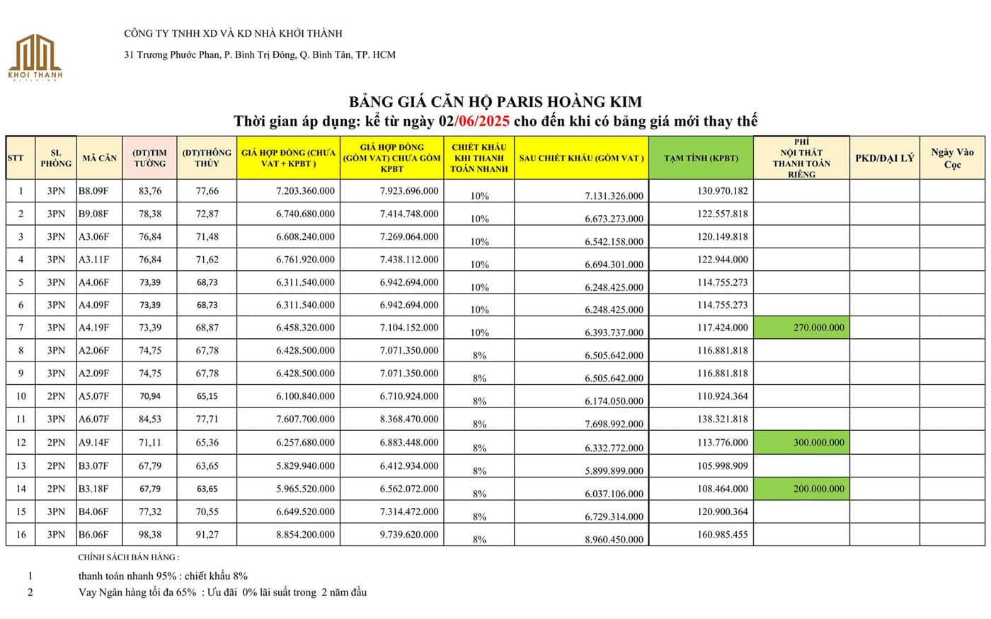 Căn hộ Paris Hoàng Kim có diện tích linh hoạt từ 57 đến 169 m², mức giá bán từ 85 – 100 triệu đồng/m². Với giá hợp lý đi cùng hệ tiện ích cao cấp, dự án là lựa chọn phù hợp để an cư lâu dài hoặc đầu tư sinh lời ổn định.