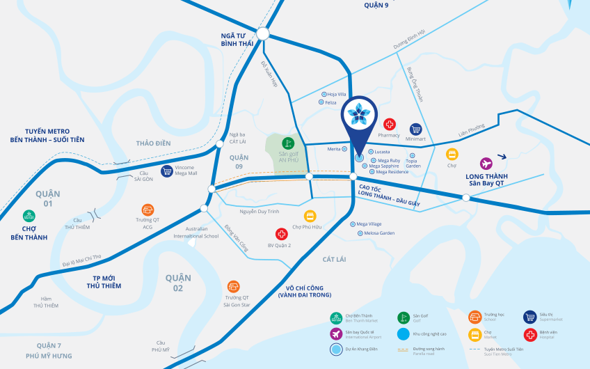 Từ vị trí Safira Khang Điền, cư dân có thể dễ dàng tiếp cận hàng loạt tuyến giao thông quan trọng như Xa Lộ Hà Nội, cao tốc TP.HCM – Long Thành – Dầu Giây, đại lộ Mai Chí Thọ và tuyến Metro số 1 Bến Thành – Suối Tiên. Nhờ đó, việc di chuyển đến các khu vực trung tâm và các khu chức năng trọng điểm trở nên nhanh chóng và thuận tiện: