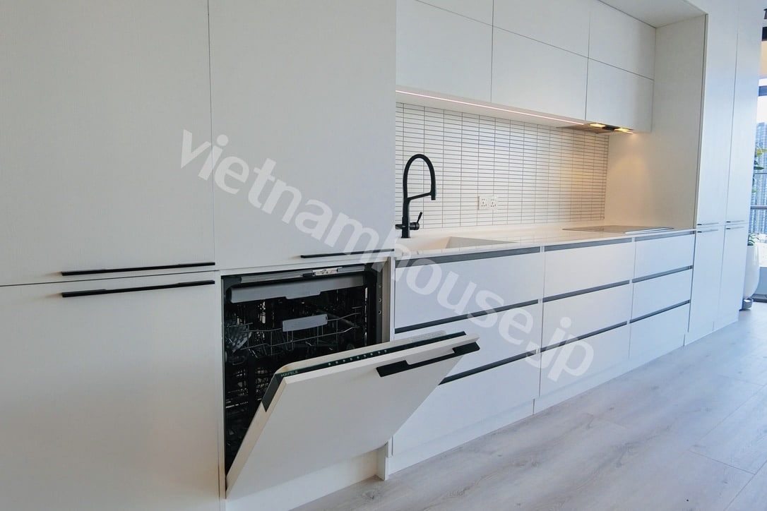 Khu vực bếp được lát gạch sáng màu và sử dụng các thiết bị hiện đại, giúp tối ưu công năng sử dụng trong khi vẫn giữ được tính thẩm mỹ cao. Phòng tắm cũng được đầu tư với thiết bị cao cấp và gam màu sáng, mang lại cảm giác sạch sẽ và thoáng đãng.
