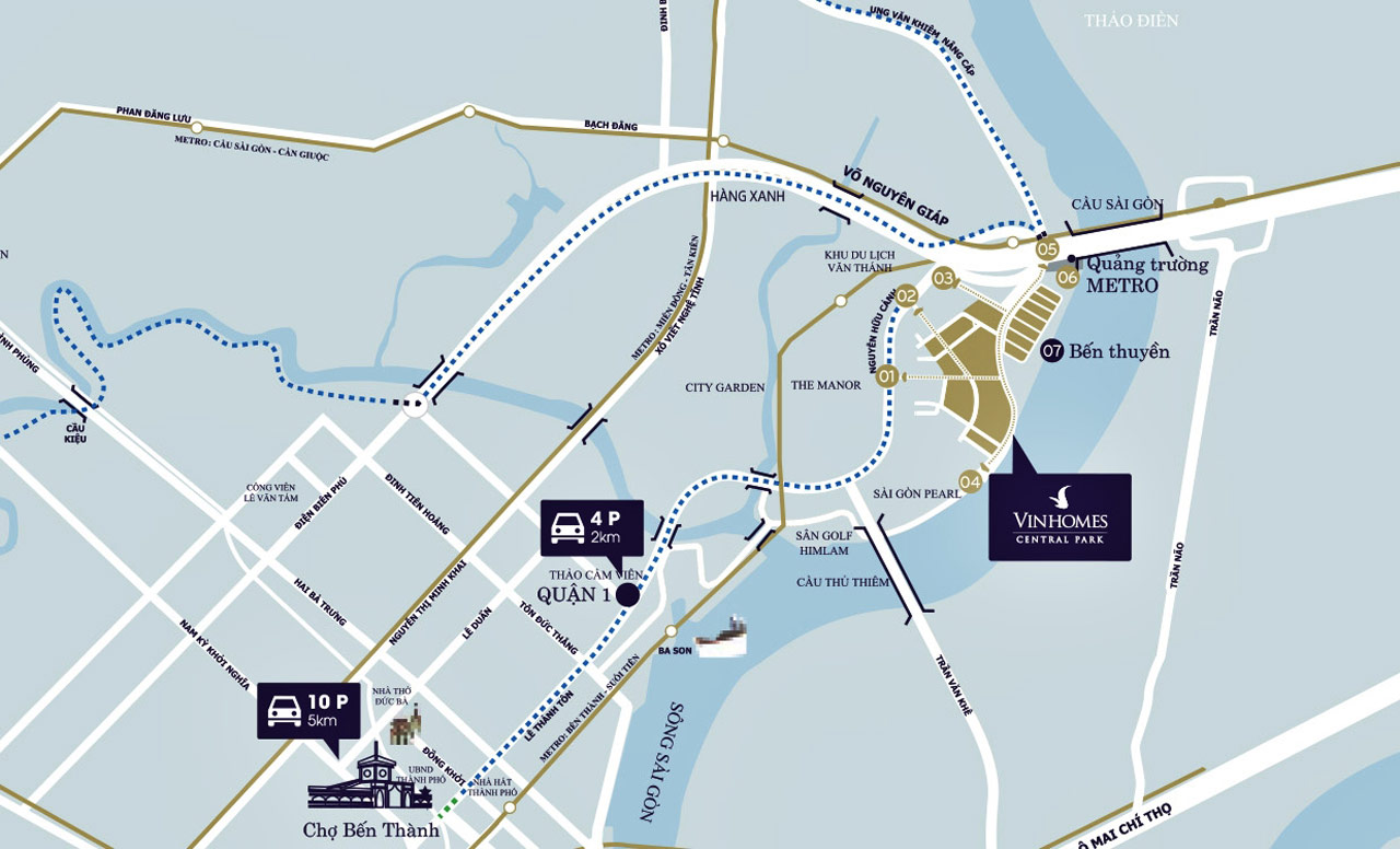 Ngoài đường bộ, dự án còn có bến du thuyền The Marina tiêu chuẩn 5 sao dành cho khách đến bằng đường thủy và ga Metro Tân Cảng chỉ cách khoảng 300m, tạo ưu thế kết nối hiếm nơi nào có được.
