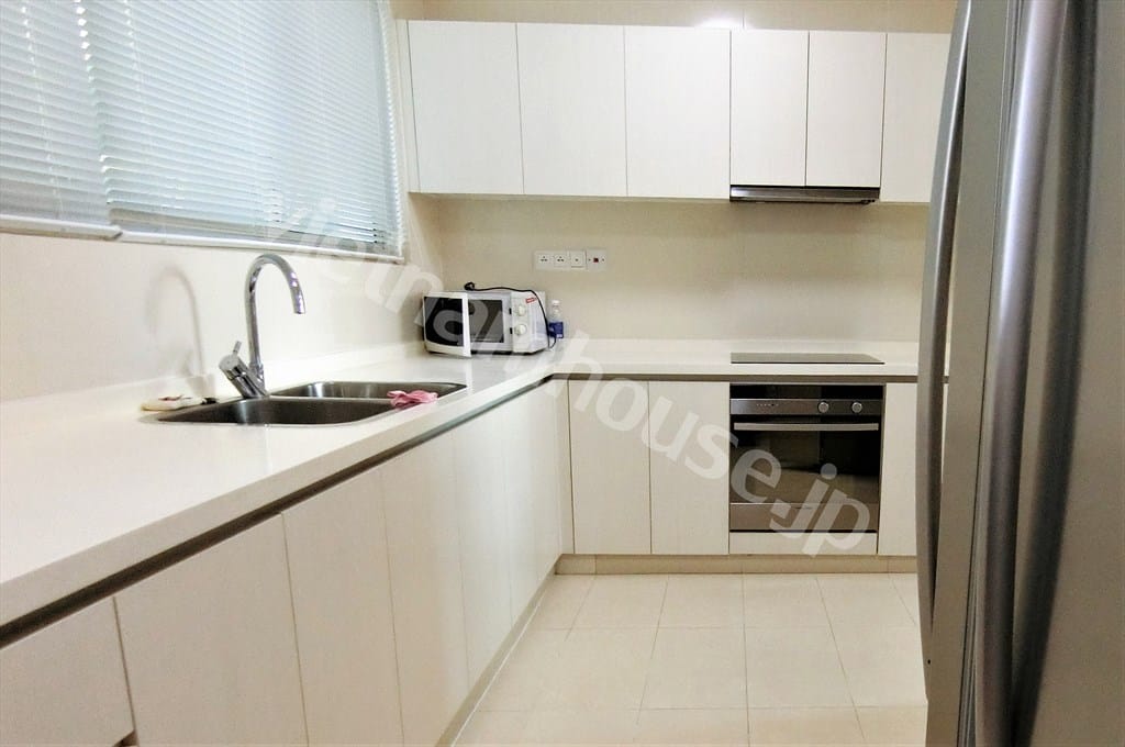 • Không gian bếp hiện đại, mặt đá sáng màu, hệ tủ lưu trữ rộng, bếp điện âm – thích hợp cho các gia đình yêu thích nấu nướng.