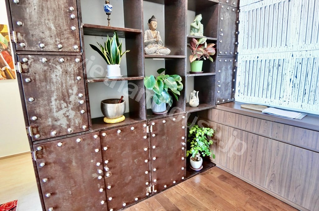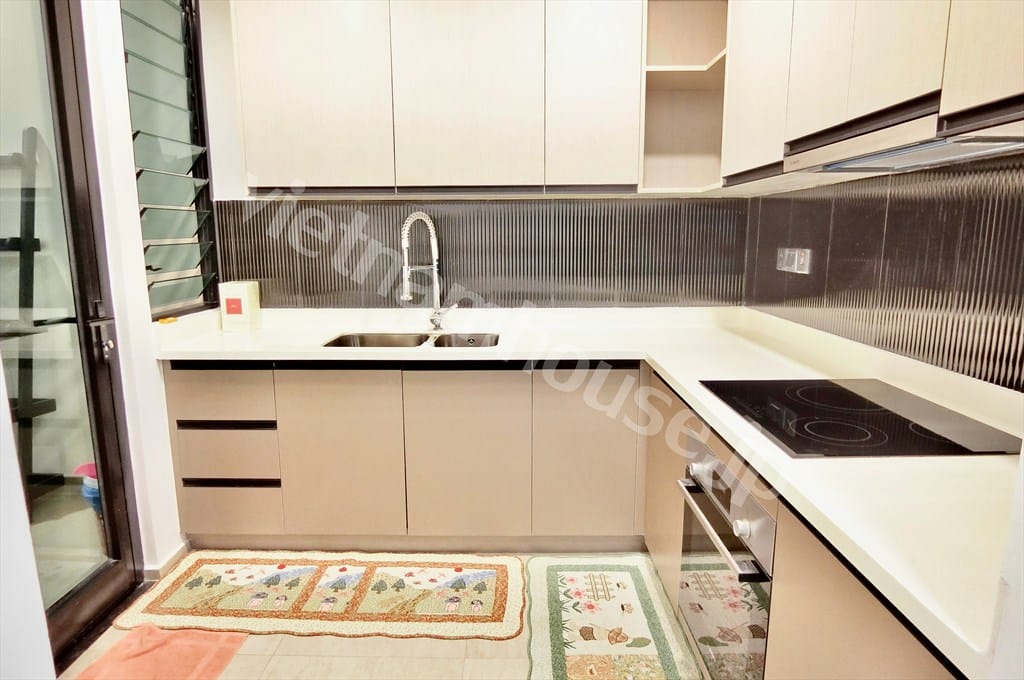 Sàn gỗ chạy xuyên suốt toàn bộ không gian, mang lại cảm giác ấm cúng. Khu bếp được bố trí gọn gàng với thiết bị bếp bằng thép không gỉ, mặt bếp kiểu dáng tối giản, dễ vệ sinh và sử dụng. Hai phòng ngủ rộng rãi, mỗi phòng đều có tủ đồ riêng. Căn hộ cũng có khu giặt ủi riêng biệt, tạo sự thuận tiện cho sinh hoạt hàng ngày.