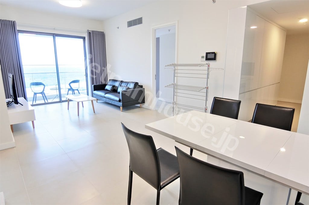 Điểm nổi bật của căn hộ này nằm ở thiết kế mở tinh tế, không gian bếp được bố trí khoa học với tone màu sang trọng, đi kèm là khu vực sinh hoạt chung rộng rãi – nơi lý tưởng để thư giãn hoặc tiếp khách. Cả hai phòng ngủ đều có diện tích lớn, ánh sáng tự nhiên tốt, và được trang bị sẵn tủ quần áo âm tường.