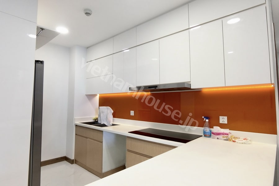 Khu vực bếp được thiết kế gọn gàng, hiện đại với đầy đủ thiết bị: bếp từ, lò vi sóng, máy hút mùi, tủ lạnh… Bàn ăn được bố trí gần cửa sổ, tận dụng ánh sáng tự nhiên, tạo không gian lý tưởng cho những bữa cơm gia đình ấm cúng và sum vầy.