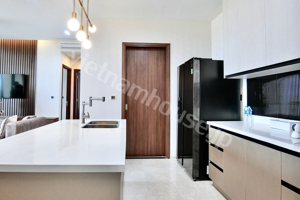 Khu bếp hiện đại với mặt đá cao cấp, đầy đủ thiết bị tiện nghi. Hai phòng tắm được bố trí hợp lý, kèm khu giặt riêng và một kho nhỏ giúp bạn lưu trữ gọn gàng hơn. Từng chi tiết trong căn hộ đều được chăm chút kỹ lưỡng, phù hợp với phong cách sống sang trọng và tiện lợi.