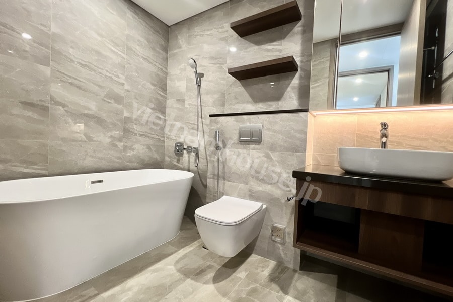 Căn hộ sở hữu thiết kế tối ưu, với hai phòng ngủ được bố trí hợp lý, phòng khách rộng rãi, bếp mở tiện lợi, và đặc biệt là phòng tắm có bồn tắm riêng, mang đến sự thư giãn tối đa.